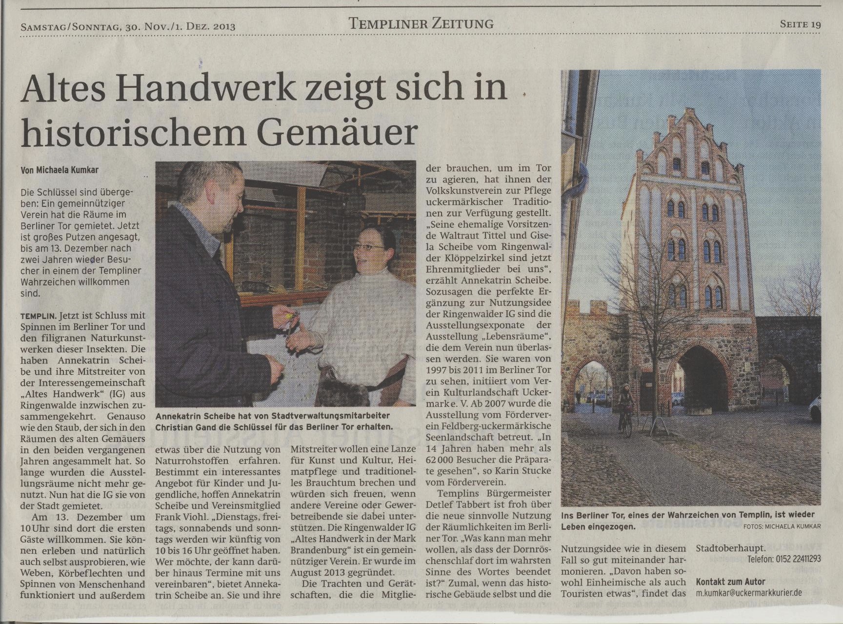| Templiner Zeitung 30.11.13 | Altes Handwerk in historischem Gemäuer | |